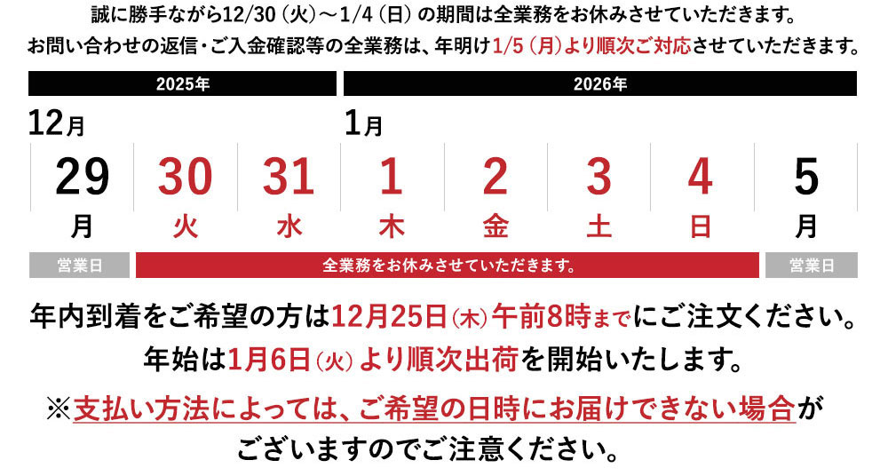 週末にご注文された場合、受注確認が月曜日となり、配達日のご希望に添えない場合がございます。