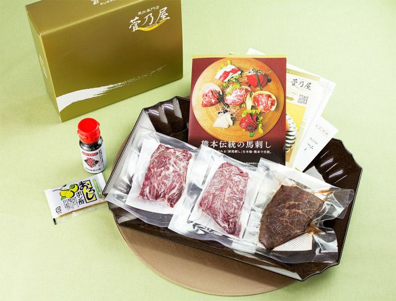 | 原材料 | ・鮮馬刺し専用タレ 醤油(国内製造)、植物性蛋白加水分解物(大豆を含む)、糖類(砂糖・砂糖混合異性化液糖)、食塩、かつお節エキス(小麦・さばを含む)/カラメル色素、調味料(アミノ酸等)、甘味料(カンゾウ、ステビア)
