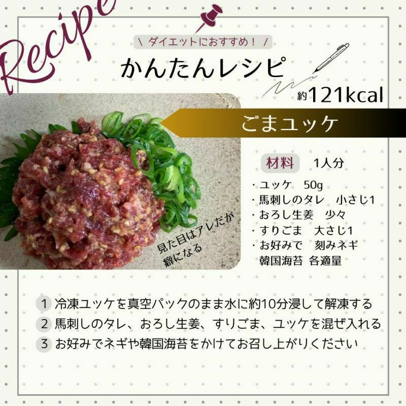 商品説明 馬の赤身の部分を線切りにした商品です。50g個食パックにしています。解凍してお好みの野菜と卵黄をまぜて、タレをかけてお召し上がり下さい。焼肉屋さんから消えたメニュー、ユッケをどうぞご自宅で堪能して下さい。