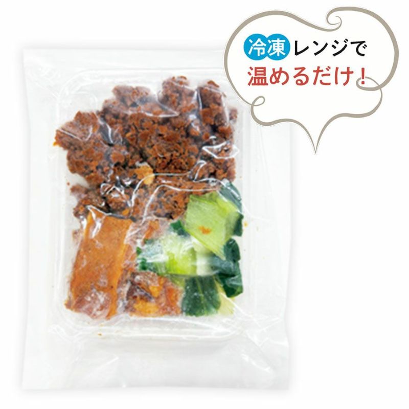 馬肉そぼろ(馬肉、玉ねぎ、甜麺醤(味噌、砂糖、植物油脂、醤油)、醤油、おろししょうが、砂糖、おろしニンニク、ごま油、豆板醤、花椒)、馬肉角煮(馬肉(カナダ産)、醤油、料理酒、つゆ、本みりん、砂糖、八角)、青梗菜/調味料(アミノ酸等)、酸味料、甘味料 (ステビア、甘草)、カラメル色素、(一部に小麦・ごま・さば・大豆を含む)