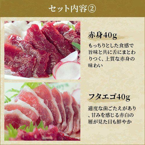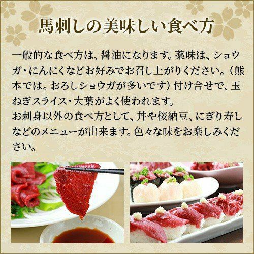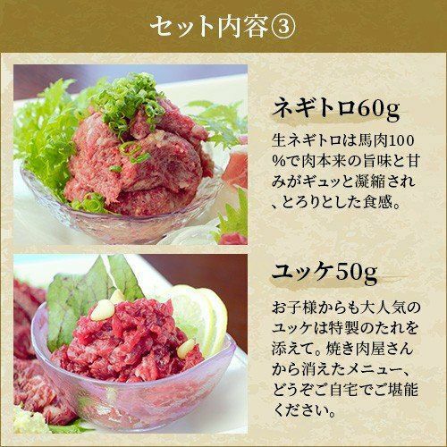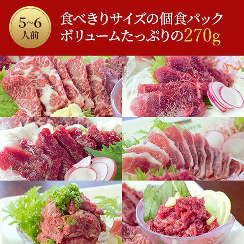 商品説明 バラエティ豊かな人気のセットはボリュームたっぷりの270gでお届けします。馬刺し、馬にぎり、カルパッチョやネギトロ丼などアレンジもお楽しみいただけます。食べきりサイズの個食パックで、カット済なので包丁やまな板が不要でとってもお手軽です。