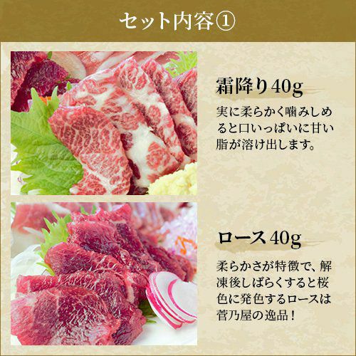 馬刺しが初めてで食べ比べを試したい方や大人数のパーティーまでシーンを選ばず、お得にご利用頂ける人気商品です。熊本の老舗馬肉レストラン菅乃屋の料理長監修のレシピをお付けしています。