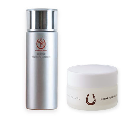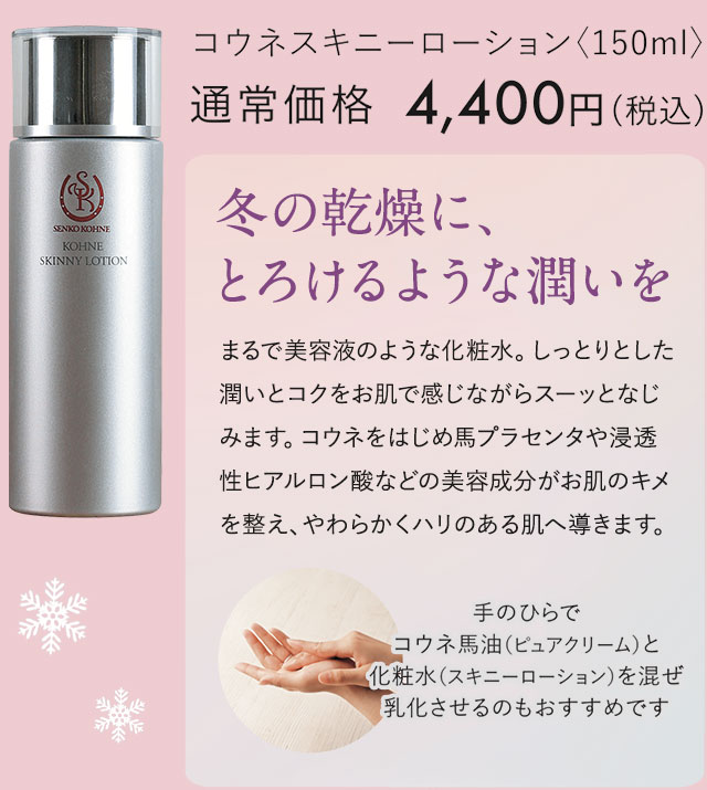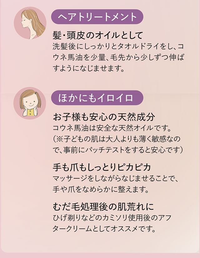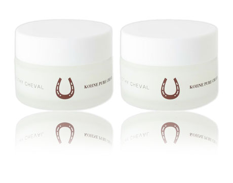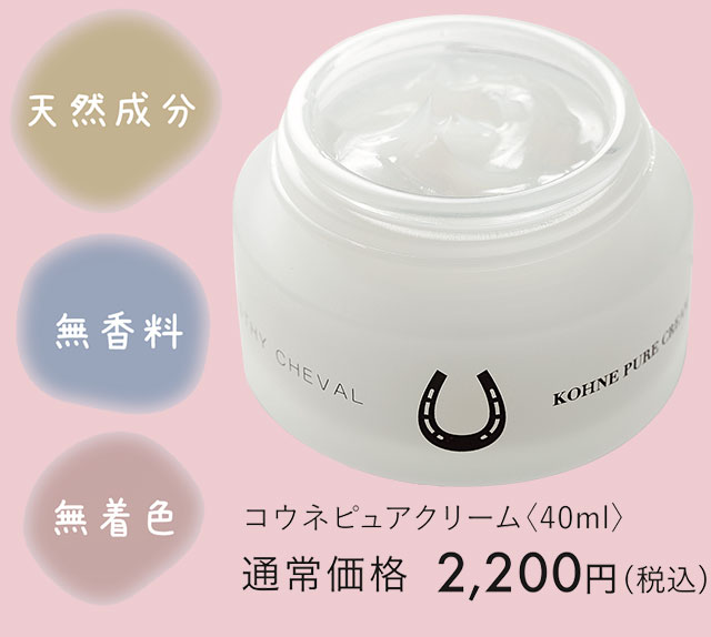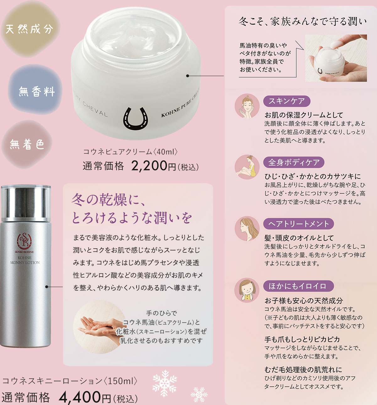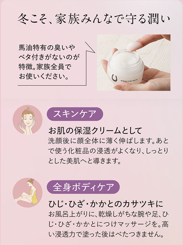 冬の乾燥に、天然成分・無香 料・無着色のコウネ馬油「コウネピュアクリーム」 を、家族みなさんでお使いください。