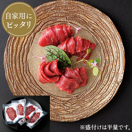 馬刺し総重量400gのたっぷりセットです。一人用にちょうどいい容量の個包装ですので、大勢が集まる席はもちろん、晩酌用に少しだけにも!