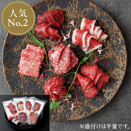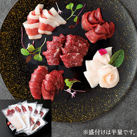 スライス馬刺し断トツの人気セット。6種の馬刺しの中には、生肉ファンに人気の赤身ユッケ、アレンジ広がる桜うまトロなどを含みバリエーションの豊かさが喜ばれています。