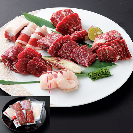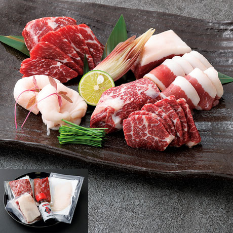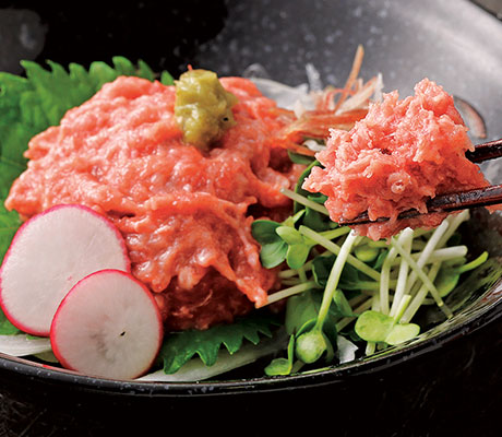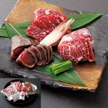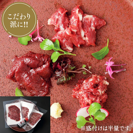 とろける霜降り、旨みの濃い赤身、いろんな食べ方が楽しめる赤身ユッケ。馬刺しの豊かな風味と上質な味わいをご堪能いただける、お店自慢の人気部位セットです。
